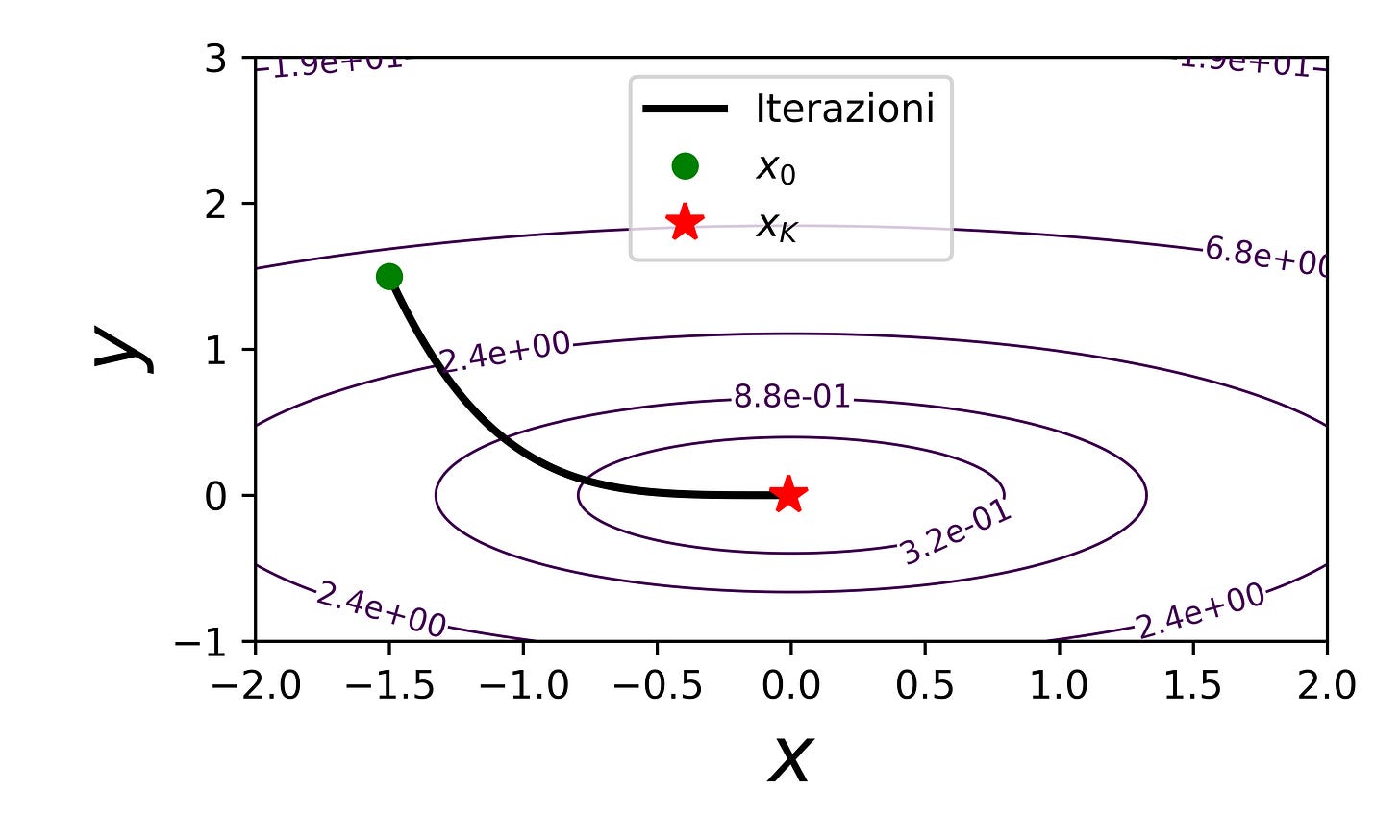 Come nel caso scalare, il metodo di discesa del gradiente è un metodo iterativo. Ciò vuol dire che partiamo da una posizione iniziale ragionevole o casuale x_0, e cerchiamo pian piano di migliorarla. Il processo continua fino a quando non raggiungiamo un livello desiderabile di approssimazione del minimo.