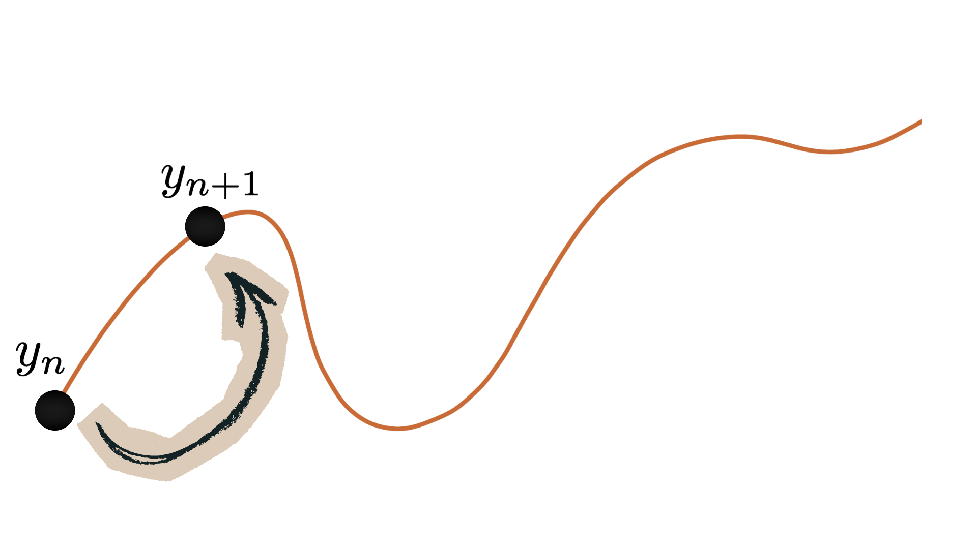 \(k_2=f\!\left(t_n+\frac{h}{2},\,y_n+\frac{h}{2}k_1\right),\)step using that slope: